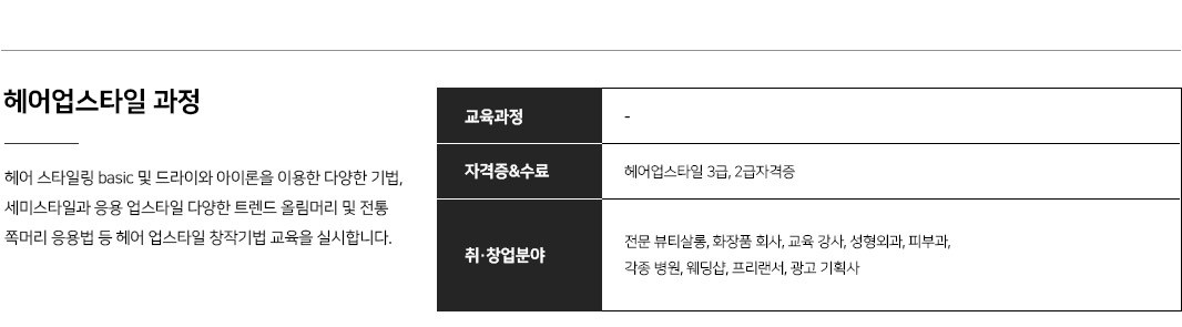 - 4개월 : 두피 스케일링 및 샴푸 기법, 헤어 컬러링 기법